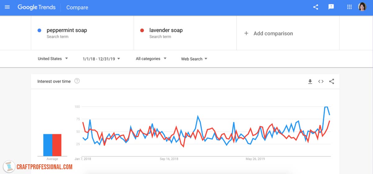 For instance, Google Trends shows us that over the course of a year, interest in "peppermint soap" and "lavender soap" is about equal. But interest in "peppermint soap" increases significantly in December - just in time for Christmas shopping.