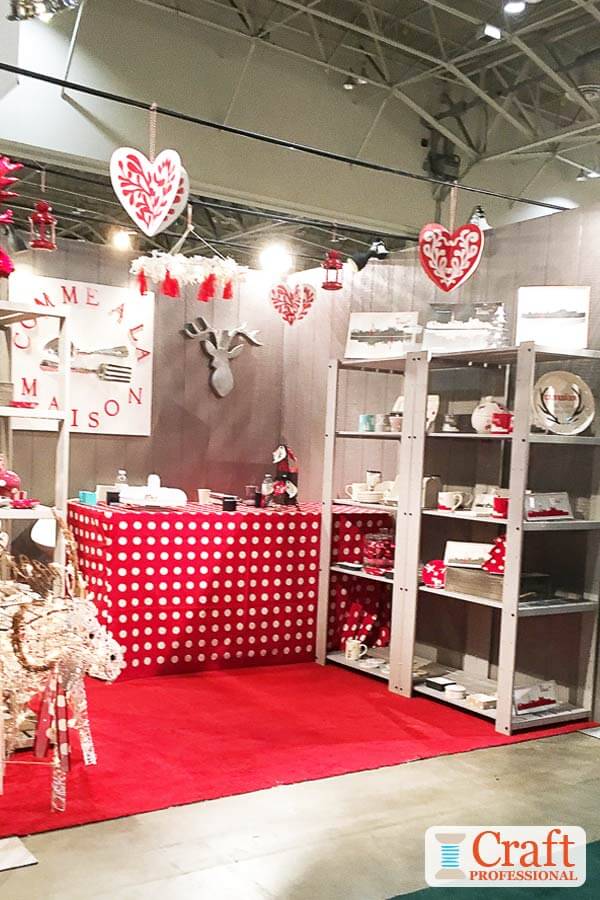 Check out the Nordic vibe in this red and gray display. It's unique, steering away from more traditional craft booth color schemes, so it stands out. Even though you can't see the products at this distance, the color scheme and overall feel of the booth communicates a style and sets that expectation for products with a Nordic charm.