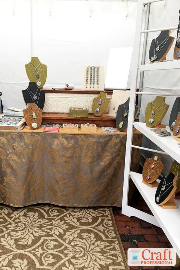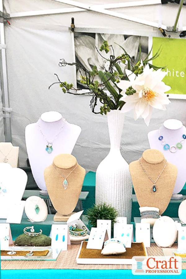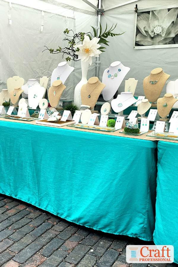 The first two photos show a booth that's effective and simple to put together. This display on folding tables is tied together by a fresh color scheme of blue, white, and brown. If you look closely at the jewelry, you'll see it all features shades of blues and greens that are similar to the table covering.