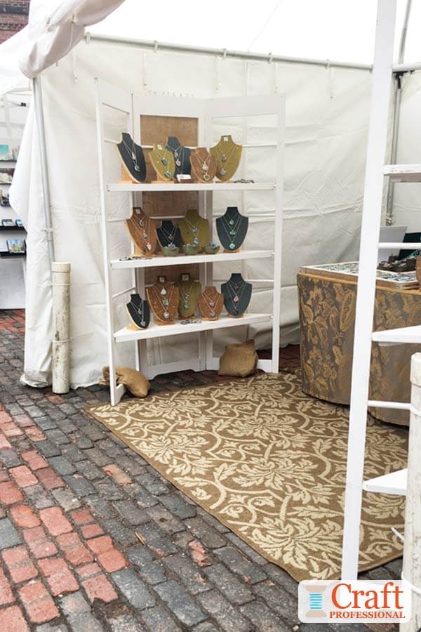 Next, I have three photos of another jewelry booth at the same outdoor show. This one also uses a tabletop to display jewelry, but the table is moved toward the back of the display space in this case, and it's paired with two portable shelves on each side of the table.