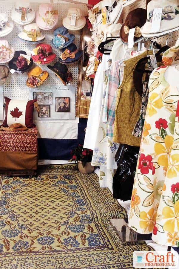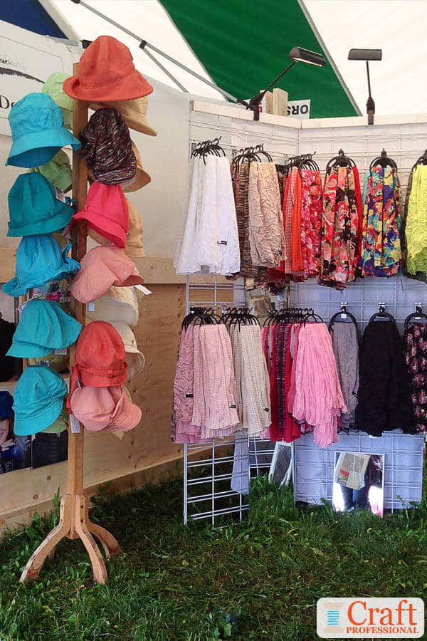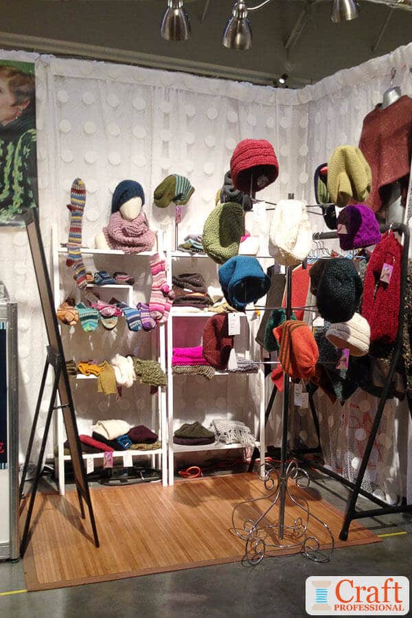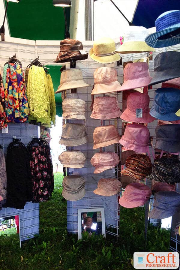 The booth on the right takes advantage of white pegboard to display some lovely hats. Pegboard is a versatile, and budget-friendly craft display option.
