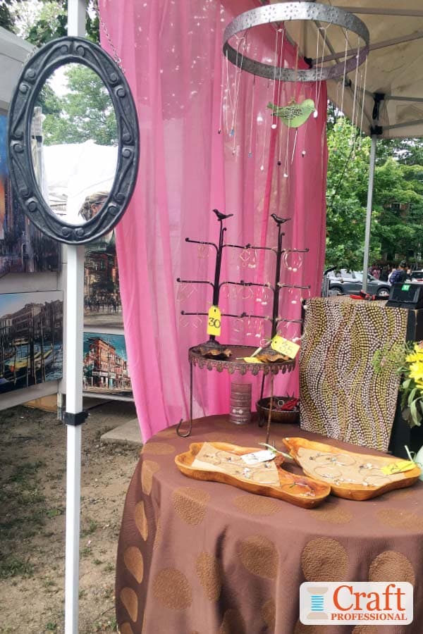 This next jewelry artist has chosen to display necklaces on very traditional white necklace busts. The jewelry is quite traditional in style, so the display works perfectly with the product and draws in the right customers.