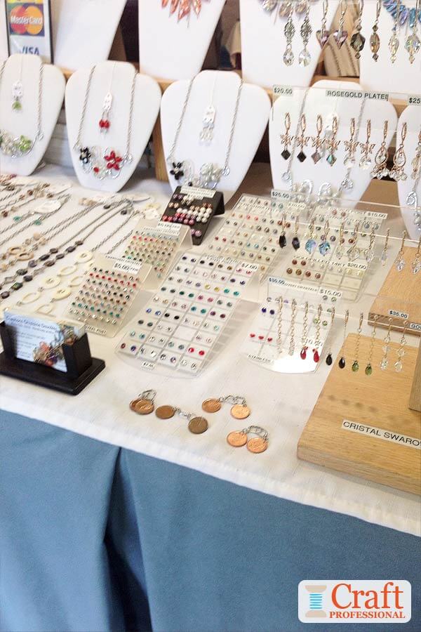 The trick with tabletop jewelry displays is to get a variety of height. Using a few different types of display stands of differing shapes and heights can help to add interest to your booth. Your stands can be different as long as they work with the style of your jewelry and as long as they work together as a whole.