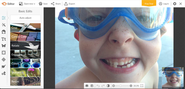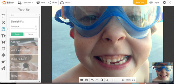PicMonkey photo editor has some good tools to touch up images. In the photo below, I used the blemish fix tool to erase all the freckles on my boy's nose.