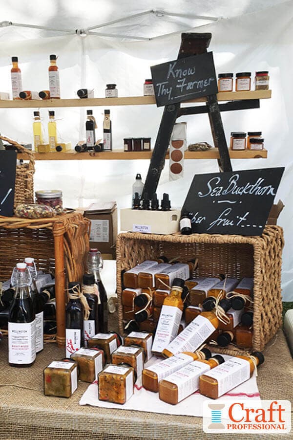 On the right, you'll see some smaller signs in the same booth that reinforce the values expressed in this business. Phrases like "know thy farmer" encourage shoppers who value small batch, locally sourced products like these.