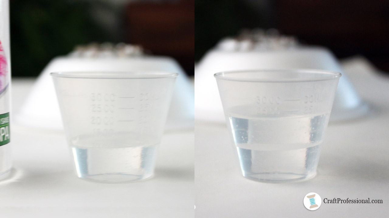 Left: Resin measured in a graduated medicine cup. Right: Equal amount of hardener poured into the same medicine cup.Epoxy resin and polyurethane resin come in two parts - resin and hardener (catalyst) - that need to be measured accurately and stirred carefully.