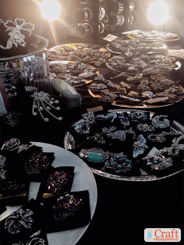 However, this profusion of jewelry works. Although there are plenty of pieces, each one is displayed with care. The display sparkles, draws the eye, and stands out amid all of the other booths.