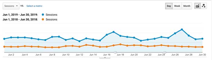 Traffic to this site (measured in sessions) from Pinterest is up 140% compared to the same time last year. The blue line represents June 2019, after I implemented the new Pinterest marketing strategy. The orange line represents June 2018, when I was using old Pinterest marketing strategies.I felt I was already creating pins that encouraged people to click through, and I was usually making reasonably good use of keywords. To grow my traffic from Pinterest, then, I felt I needed a larger presence. I needed to get more pins out there.